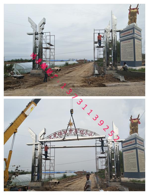 村口標(biāo)志性雕塑為山西省河曲縣文筆鎮(zhèn)岱岳殿村建設(shè)的扶貧養(yǎng)殖基地制作的企業(yè)不銹鋼大門口,不銹鋼牌樓總寬度12米,路寬8米。此款不銹鋼大門安裝完畢后大大提升了企業(yè)的形象、企業(yè)面貌,得到了村委、鄉(xiāng)鎮(zhèn)、縣委領(lǐng)導(dǎo)的一致好評!