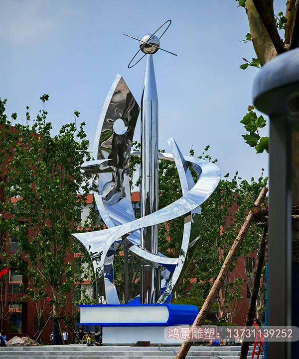 這座校園科技創(chuàng)新雕塑安裝于山東濱州職業(yè)科技學院,以現(xiàn)代簡約的不銹鋼材質打造,整體造型猶如一束躍動的智慧之光。主體采用鏡面拋光工藝的不銹鋼板,經過精密激光切割后形成錯落有致的幾何切面,在陽光下折射出璀璨的科技光芒。雕塑基座鑲嵌著;崭〉瘢捎没瘜W蝕刻工藝將校訓文字與齒輪、芯片等科技元素完美融合。