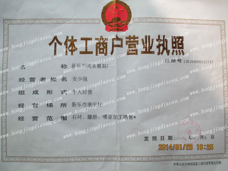 雕刻廠營(yíng)業(yè)執(zhí)照是榮譽(yù)資質(zhì)的一種分類(lèi)。石家莊鴻景不銹鋼雕塑廠專(zhuān)業(yè)制作各種雕刻廠營(yíng)業(yè)執(zhí)照,如有需要雕刻廠營(yíng)業(yè)執(zhí)照歡迎聯(lián)系我們,我們免費(fèi)為您提供雕刻廠營(yíng)業(yè)執(zhí)照?qǐng)D片,雕刻廠營(yíng)業(yè)執(zhí)照價(jià)格等相關(guān)信息。雕刻廠營(yíng)業(yè)執(zhí)照?qǐng)D片由石家莊鴻景不銹鋼雕塑廠2014年09月22日上傳,歡迎撥打鴻景雕塑公司電話,我們?yōu)槟峁└嗟牡窨虖S營(yíng)業(yè)執(zhí)照資料信息。石家莊鴻景不銹鋼雕塑廠推薦查看跟雕刻廠營(yíng)業(yè)執(zhí)照相關(guān)的產(chǎn)品信息:雕刻